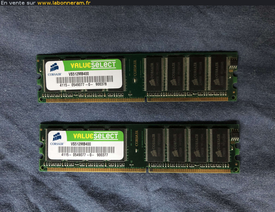 Vends deux barrettes RAM 512MB Corsair pour ordinateur de bureau. Vendu par 2 ou séparément : 5 euros la barrette seule, 8 euros les deux. Récupération en main propre ou par envoi postal. Paiement de préférence via Paypal.