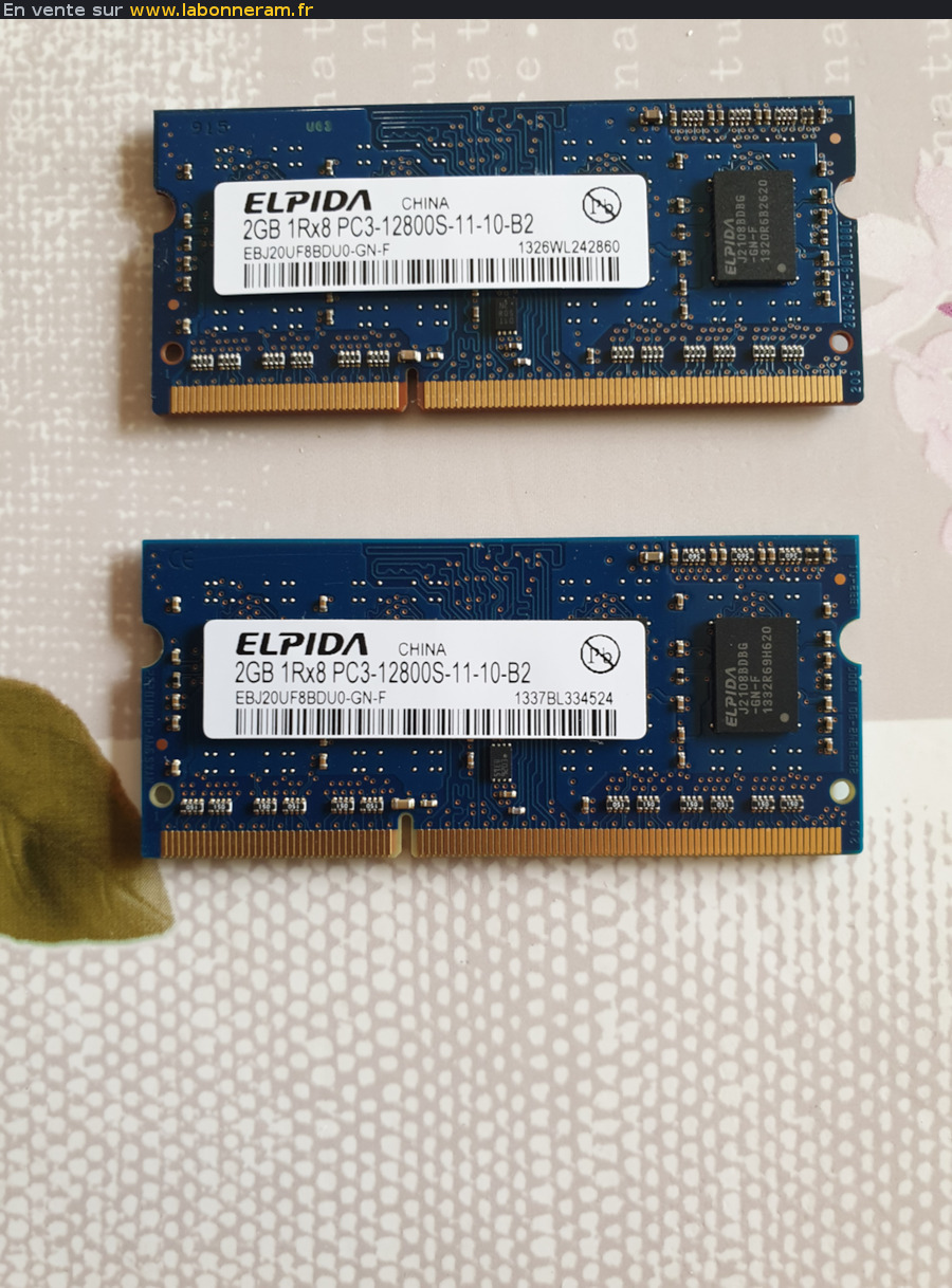 2 barrettes de RAM de 2GO de marque Elpida DDR3 1600 MHz,
