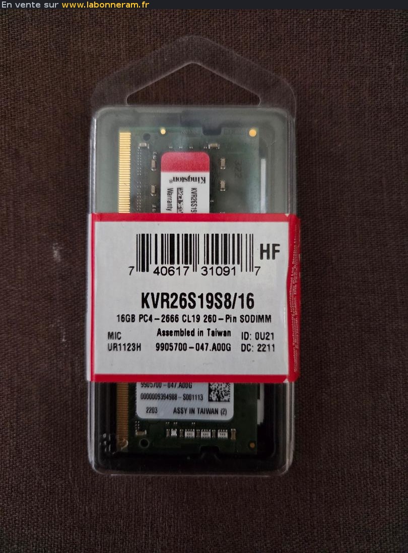 Barette Sodimm kingston 16 GB PC4 2666 CL 19 260 - Pin SODIMM. Achetée pour NAS Synology mais non reconnue. J'ai trop tardé à faire l'essai et je n'ai pu la renvoyer. Donc déballée mais jamais servie.