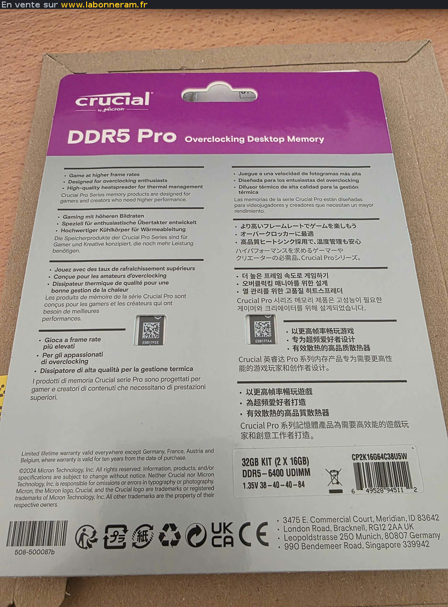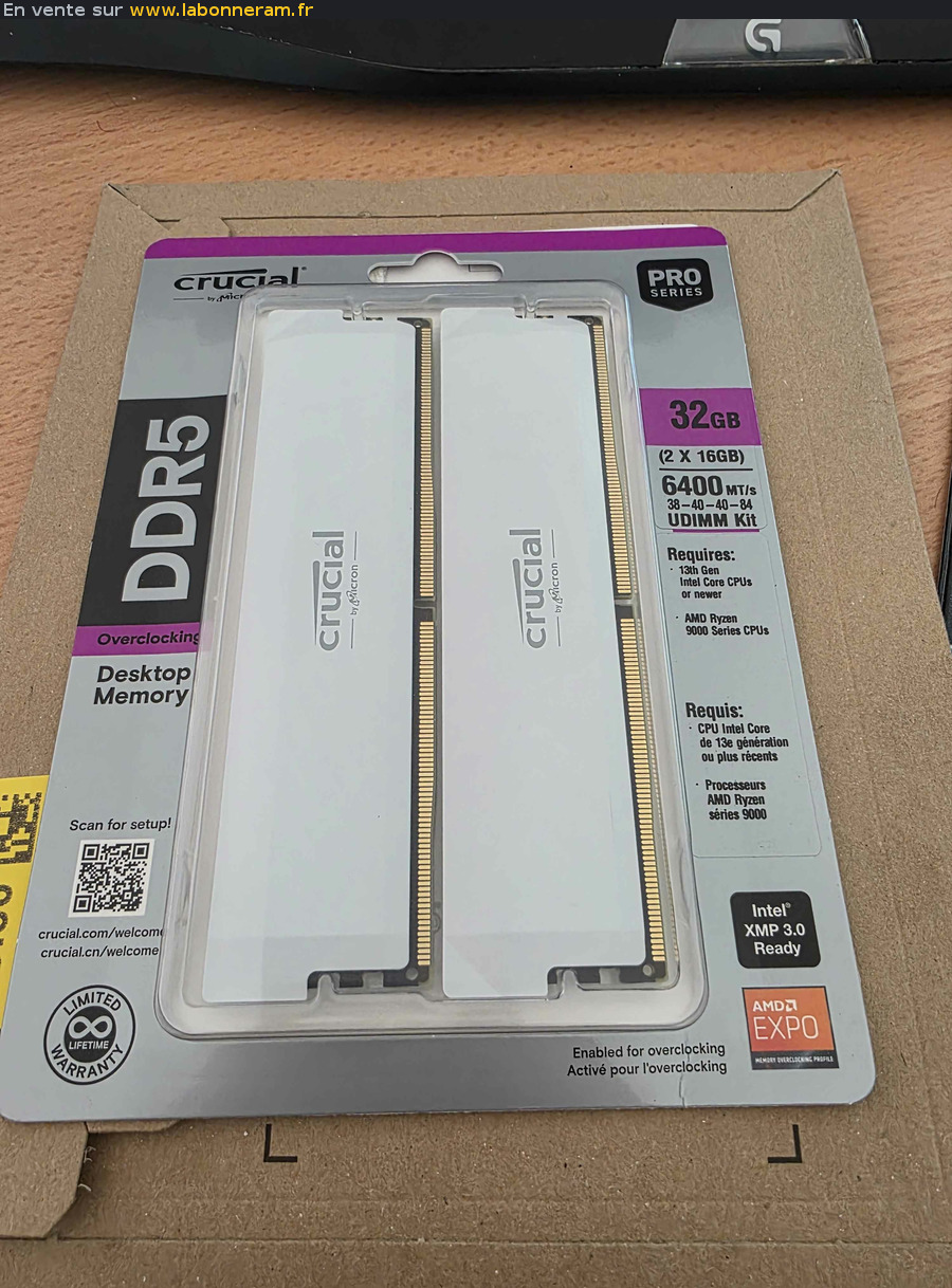 un kit Crucial Pro DDR5 32 Go (2×16) Blanche, fréquence 6400 MHz CL38, 100% neuf et scellé, jamais ouvert.