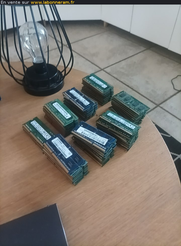 Gros lot de 75 barrettes DDR3 de 4GO chacune, de marques différentes (principalement Kingston et Samsung mais quelques unes sont d'autres marques).N'hésitez pas si vous avez des questions! (Du fait de leurs nombres, je n'ai pas pu préciser leurs caractéristiques détaillés)