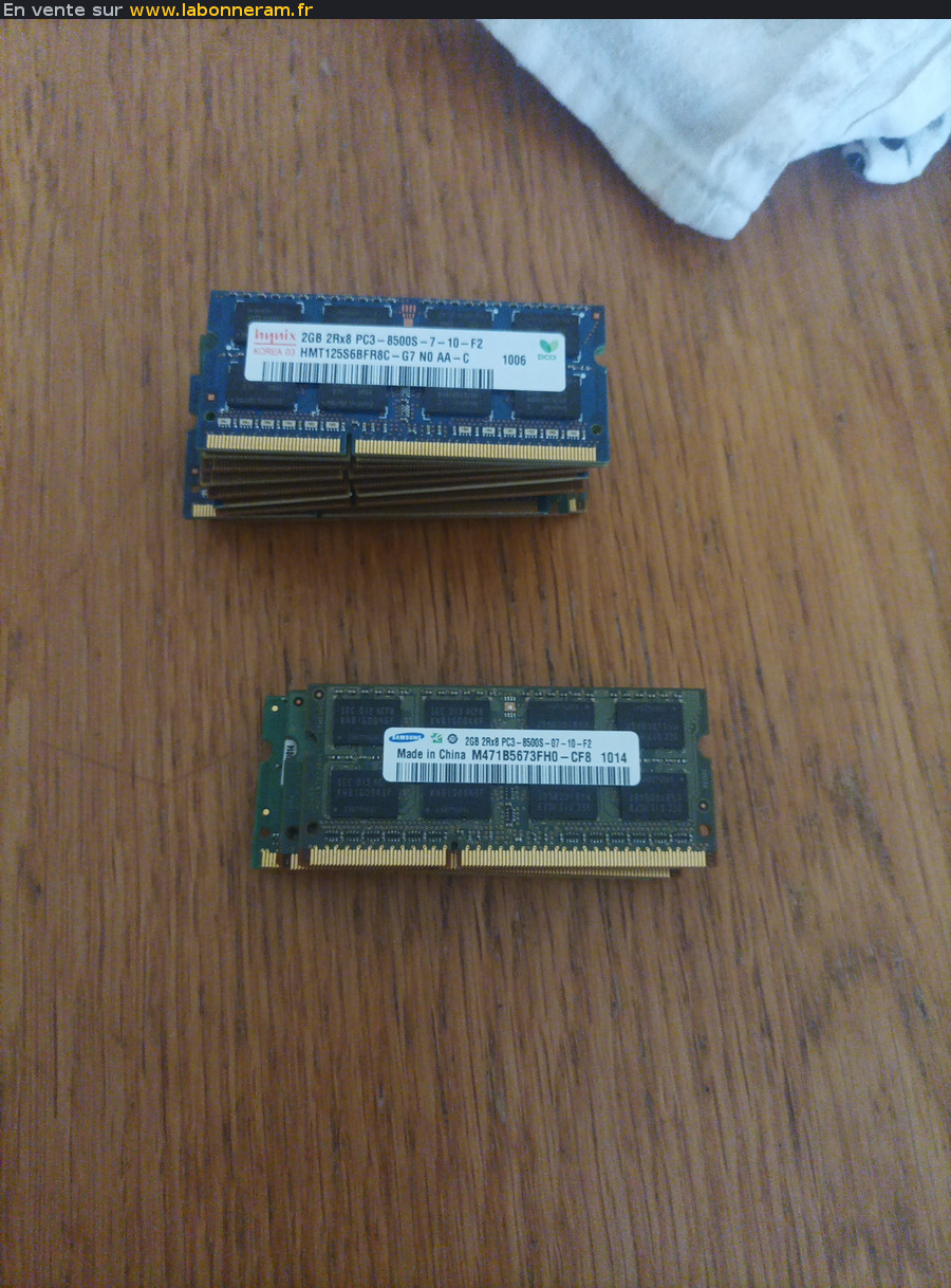 Lot de 15 ram DDR3 de 2GO chacune, principalement de marque Samsung mais aussi une ou deux Kingston et Hynnix.Si vous avez des questions,n'hésitez pas a me contacter!